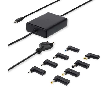 Adaptér k notebooku; univerzální nabíječka 100W pro notebooky s USB-C konektorem a podporou Power Delivery; dodáváno s 10 DC napájecími konektory pro většinu oblíbených značek notebooků; automatická volba napětí; extra dlouhý kabel o délce 2,5 metru