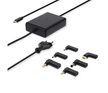 Adaptér k notebooku; univerzální nabíječka 65W pro notebooky s USB-C konektorem a podporou Power Delivery; dodáváno s 6 DC napájecími konektory pro většinu oblíbených značek notebooků; automatická volba napětí; extra dlouhý kabel o délce 2,5 metru