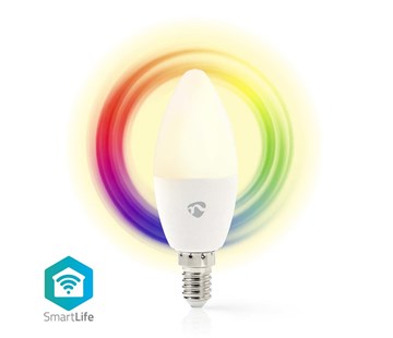 SmartLife žárovka LED RGB E14, Svíce.Plnobarevná, 4.9W a 2700 - 6500 K. Plug & play: připojení přímo k síti Wi-Fi. Podporuje hlasové ovládání Amazon Alexa a Google Home a další automatizace prostřednictvím aplikace Nedis SmartLife