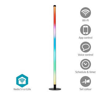 LED smart stojací lampa • 135 LED světel • barva světla RGBIC • nastavitelná teplota barev (2 700 K až 6 500 K) • možnost stmívání osvětlení • 12 světelných režimů • Wi-Fi připojení • mobilní aplikace Nedis SmartLife • lze ovládat prostřednictvím hlasových asistentů Alexa a Google Assistant • maximální spotřeba 10 W • životnost 20 000 hodin • IP 20 • jmenovitý světelný tok 180 lm • 1m přívodní kabel • kovový podstavec • výška 1,05 m