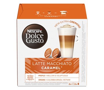 Nestlé Nescafe Latte Caramel je balení 16ti kapslí, ze kterých uděláte 8 lahodných porcí nápoje. Kapsle jsou hermeticky uzavřeny a tím zaručují stálou čerstvost. Pro přípravu stačí vložit nejprve kapsli s mlékem do vašeho přístroje Dolce Gusto a poté kávu. Nestlé Nescafe Latte Caramel kombinuje nejprodávanější variantu NESCAFE Dolce Gusto Latte Macchiato s lahodným karamelem. Právě karamel dokáže chuť Macchiata ještě podpořit.