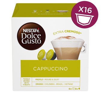Balení obsahuje 8 kapslí kávy a 8 kapslí mléka, napěněné horké mléko, s nízkým obsahem tuku, v malém množství bohatého tmavého espresa. 161,6g