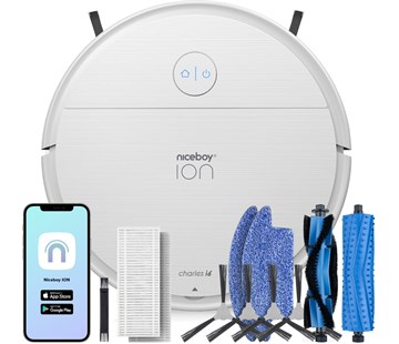 | Vysavač efektivně a v co nejkratším čase pokryje celou vysávanou plochu. Vysavač se vyhne překážkám, jako jsou nábytek a kabely, a při potřebě dobití baterie se sám vrátí na nabíjecí stanici, dobije se a pokračuje v úklidu tam, kde přestal. Mobilní aplikace Niceboy ION ještě dále usnadňuje celý proces. Zde si nastavíte čas úklidu a vysavač se postará o všechno ostatní, zanechávajíc vám čisté podlahy. Se zabudovanou podporou hlasového asistenta Google Assistant stačí k perfektnímu úklidu jen pár slov. Vše pro pohodlný provoz najdete v jednom balení. Ve výbavě naleznete např. další univerzální středový kartáč, náhradní přimetací kartáčky, HEPA filtr nebo čisticí štěteček atd. |  |
