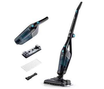 tyčový vysavač • Li-Ion baterie • doba nabíjení 4–4,5 h • výdrž na jedno nabití až 70 min • LED kontrolky stavu baterie • LED diody na hlavici • objem prachové nádoby 0,6 l • objem nádoby na vodu 0,2 l • odnímatelný ruční vysavač • hlučnost 78 dB • technologie Cyclone PRO • filtrační systém MAX Clean • příslušenství – podlahový kartáč, mopovací nádržka, mop, nástavec 2v1, nabíjecí adaptér • hmotnost 2,5 kg