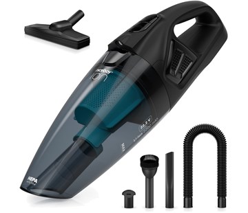 akumulátorový ruční vysavač • 22,2V Li-Ion baterie • objem prachové nádoby 0,5 l • doba nabíjení 4 h • HEPA filtr • až 25 minut provozu • úroveň hluku 78 dB • hmotnost 1 kg • suché i mokré vysávání • obsah balení: vysavač, nabíjecí stanice, štěrbinová hubice, gumová hlava, malý kulatý kartáč, ohebná hadice, podlahový nástavec