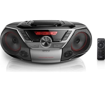 CD přehrávač • FM příjem • výkon 12 W • přehrává MP3-CD, WMA-CD, CD, CD-R/RW • USB • Bluetooth® • NFC • digitální tuner s předvolbami až 20 stanic • konstrukce Bass Reflex • funkce Dynamic Bass Boost • funkce Náhodný výběr/Opakování • vstup 3,5 mm • dálkový ovladač • hmotnost 2,9 kg • napájení 220 – 240 V nebo přes baterie (6× LR20)