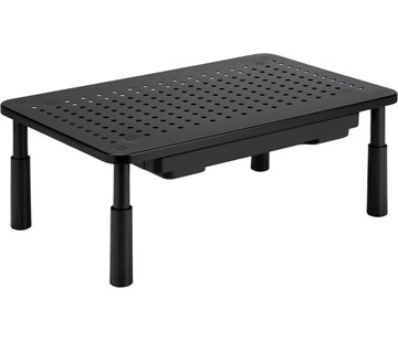 Podstavec pod monitor/notebook;výškově nastavitelný ve 3 úrovních 10/12/14cm;Cirkulace vzduchu;Přihrádka pro kancelářské potřeby;Úložný prostor pod pracovní plochou;Protiskluzové podložky;Vhodná velikost obrazovky:13~32";Materiál:ocel+plast;Tloušťka povrchu:0,9cm;Nosnost:20kg;Protiskluzové podložky