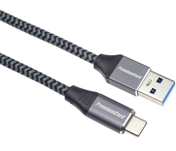 PremiumCord kabel USB-C - USB 3.0 A (USB 3.1 generation 1, 3A, 5Gbit/s) USB-C samec - USB 3.0 typ A samec, přenosová rychlost: Super-speed 5Gbit/s, až 10x rychlejší než standardní USB2.0 pozlacené konektory, kovové hliníkové krytky konektorů, kabel s textilním bavlněným černo-bílým opletem