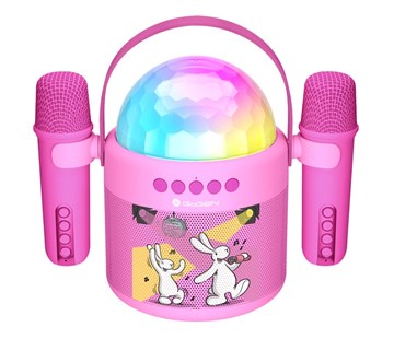 přenosný reproduktor; RMS výkon 6,5 W; Bluetooth; přehrávání MP3; výdrž baterie 5 h (50% hlasitosti); efekty světelné/hlasové; vstupy USB/AUX/MicroSD; Karaoke (2x bezdrátový mikrofon v balení); USB-C nabíjecí konektor; barva růžová; rozměry 21,5x16,5x12,5 cm; hmotnost 0,76 kg