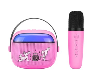 přenosný reproduktor; RMS výkon 3,2 W; Bluetooth; přehrávání MP3; výdrž baterie 5 h (50% hlasitosti); efekty světelné/hlasové; vstupy USB/AUX/MicroSD; Karaoke (mikrofon v balení); USB-C nabíjecí konektor; barva růžová; rozměry 12,5x9,5x9,5 cm; hmotnost 0,4 kg