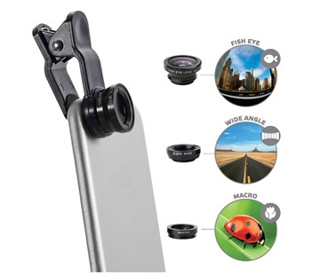 CLIP AND CLICK od CELLY je sada fotografických objektivů pro nadšence do fotografování, kteří chtějí větší možnosti. Součástí sady je univerzální, pružinový klip se závitem pro upevnění objektivů na čočku fotoaparátu vašeho smartphonu. Díky 3 různým čočkám můžete pořizovat skvělé fotografie s efektem rybí oko, širokoúhlé snímky nebo makro fotografie. Objektiv rybí oko dokáže zachytit fotografie v úhlu 180°, fotografie mají charakteristický kulovitý efekt, ideální pro fotografování krajin nebo legračních portrétů. Širokoúhlý objektiv je vhodný pro fotografování panoramat. Makro objektiv umožňuje pořizovat detailní fotografie např. květin nebo hmyzu z těsné blízkosti. Makro objektiv lze aplikovat na smartphony nebo tablety s čočkou o průměru až 8 mm. Objektivy neslouží pro profesionální použití. Nevyžadují žádnou aplikaci.