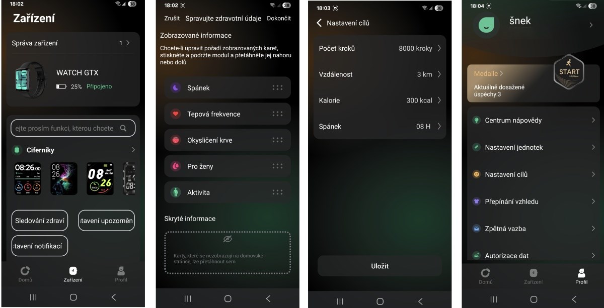 Kromě zdravotních funkcí potěší i praktické chytré vychytávky – například hledání telefonu, předpověď počasí nebo režim spánku/nerušit. Samozřejmě nechybí ani klasické časové funkce jako budík, časovač nebo stopky.