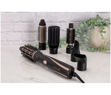 kulmofén • příkon 1200 W • 2 stupně nastavení rychlosti a teploty • funkce studeného vzduchu Cool Shot • ionizační technologie • 3m přívodní kabel s otočným kloubem • závěsné poutko • odnímatelná mřížka • 6 stylingových nástavců (kartáče s keramickým povrchem a smíšenými štětinami o průměru 50, 38 a 25 cm, koncentrátor vzduchu, nástavec Root Boost, plochý kartáč) • úložné pouzdro