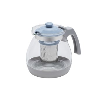čajová konvice, objem 1200 ml, nádoba s plastovou rukojetí, vyrobeno z borosilikátového žáruvzdorného skla, silikonový odnímatelný protiskluzový podstavec, nerezový filtr, plastové víko