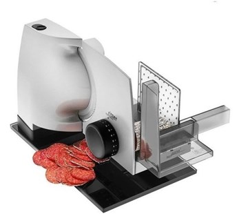 Nerezový kotouč je opatřen zoubkováním. Jeho průměr činí 170 mm. Tloušťku řezu si můžete nastavit pomocí otočného knoflíku v rozmezí od 0 do 20 mm. Podstavcová deska je vyrobena z odolného skla, které celému spotřebiči dodává ještě větší šmrnc. |