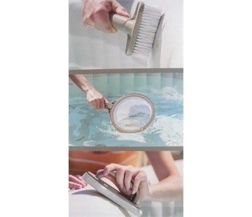 Zakřivený kartáč vám pomůže očistit vnitřní boční stěny. Odolná skimmerová síťka odstraní z vířivky spadané listí a další nečistoty. S pomocí houbičky se zbavíte veškeré špíny a usazeného kalu.