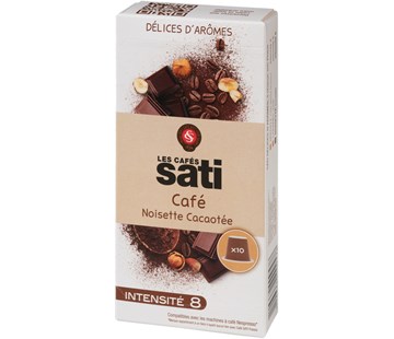 Kapsle Sati Arabica Noisette Cacaotée, kvalitní Arabica aromatizovaná příchutí pražených lískových oříšků a kakaa. Jemné a plné espresso s nezaměnitelnou chutí a vůní pro chvíle pohody. Intenzita 8, Balení 55 g (10 x 5,5 g), Kapsle - home compostable