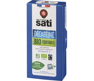 Kapsle Sati Décafeiné BIO Fairtrade, 100% bezkofeinová Arabica z Jižní Ameriky bohatá na chuť, jemně pikantní s dobrou aromatickou komplexností.Moderní přírodní styl dekofeinace bez chemických látek. Intenzita 5, Balení 55 g (10 x 5,5 g), Kapsle - home compostable