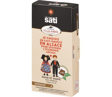 Kapsle Sati Hansi, 100% Arabica ušlechtilého původu ze skvělých odrůd z latinské Ameriky a Východní Afriky. Sametová, voňavá a lehounce nakyslá káva s jemným charakterem. Pocta alsaskému výtvarníkovi s přezdívkou Oncle Hansi. Intenzita 6, Balení 55 g (10 x 5,5 g), Kapsle - home compostable