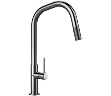Stojánková dřezová baterie, provedení Masivní nerezová ocel, výška 383 mm, vytahovací koncovka s přepínačem na sprchu, pro otvor 35 mm, otočná o 360 °