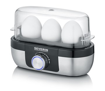 Před spuštěním stačí naplnit zásobník na vodu potřebným množstvím tekutiny, s pomocí jehly propíchnout skořápku, vejce umístit do držadla uvnitř vařiče a nasadit průhledné víko. Spotřebič je opatřen otočným ovladačem, který slouží k nastavení požadované tvrdosti vajec. Jemným otočením knoflíku přesně zvolíte, jak má vejce uvnitř vypadat. Po ukončení přípravy se rozezní zvukový signál, který vás upozorní, že je možné vejce ze spotřebiče vyjmout. Příkon vařiče vajec Severin EK 3163 je 270 W. |
