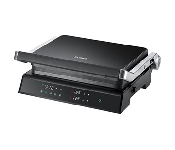 kontaktní gril • příkon 1800 W • nepřilnavé grilovací desky • maximální teplota 230 °C • rozměr grilovacích desek 30×22 cm • 5 automatických programů • časovač • displej • dotykový ovládací panel • sběrný zásobník na odkapávaný tuk