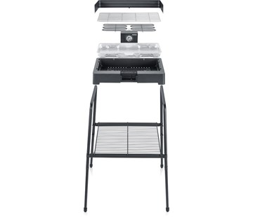Gril disponuje topným tělesem o výkonu 2200 W, což zajišťuje rychlé rozehřátí a rovnoměrné rozložení tepla po celé grilovací ploše. Teplotu lze plynule regulovat pomocí otočného termostatu, díky čemuž si snadno přizpůsobíte intenzitu grilování různým druhům potravin – od šťavnatých steaků po zeleninu nebo ryby. Tento model je vybaven odnímatelným stojanem, který umožňuje použití grilu jak jako volně stojícího zařízení na zahradě, tak jako stolní gril například na kuchyňské lince nebo stole. Stojan je stabilní a doplněný praktickou odkládací poličkou pro uložení nádobí, koření či grilovacích pomůcek. Díky nízké hmotnosti je celý gril snadno přenositelný a uskladnitelný. Díky odnímatelné grilovací mřížce a misce na vodu je údržba velmi snadná – většinu dílů lze jednoduše vyjmout a opláchnout, případně umýt v myčce. |