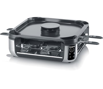elektrický gril • příkon 1900 W • grilovací deska (30 × 30 cm) s povlakem ILAG • nastavitelný termostat • odsávání kouře • LED displej • prostor pro 8 raclette pánviček • grilovací deska a pánve vhodné do myčky • protiskluzové gumové nožičky