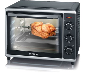 stolní trouba • objem 30 l • příkon 1600 W • 4 druhy ohřevu • otočné ovládání • nastavení teploty 0–230 °C • horkovzdušné pečení • horní ohřev s otáčivým grilem • časovač • otočné ovladače • tác na drobky • příslušenství – rošt na pečení s rukojetí, otočný rožeň, pečicí plech s rukojetí • 34,5×45,3×40 cm