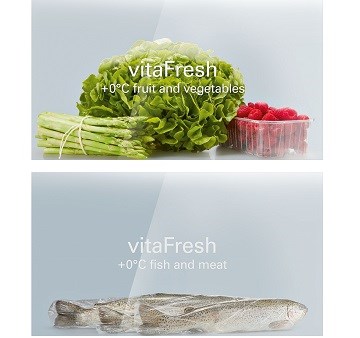 Ve spodní části chladničky se nachází zásuvky, ve kterých se teplota pohybuje okolo 0 °C, jejich celkový objem činí 56 l. Jedna zásuvka hyperFresh premium 0 °C je vhodná k uskladnění ovoce a zeleniny a lze v ní jednoduše regulovat vlhkost. Díky tomu zůstanou uskladněné potraviny až 3krát déle čerstvé a zachovají si svou vůni, chuť a výživové hodnoty. Nechybí zde ani druhá zásuvka hyperFresh premium 0 °C, která je ideální ke skladování masa a ryb.