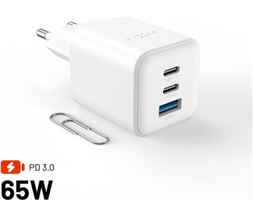 Síťová GaN nabíječka FIXED Mini s 2xUSB-C a USB výstupem, podpora PD, 65W, bílá
