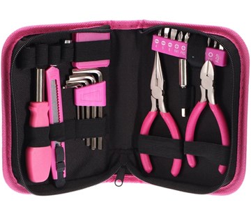 Sada nářadí HOME PINK 26 SIXTOL; Sada se skládá z nářadí jako jsou kleště, imbusy, šroubovací rukojeť a další nejpoužívanější nářadí; Sada nářadí je oblíbená pro svou skladnost a praktičnost; uložena ve stylovém textilním růžovém pouzdře na zip; počet kusů: 26; uhlíková ocel; rozměry: 5 x 18 x 13 cm