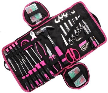Sada nářadí HOME PINK 120 BAG SIXTOL; Sada se skládá z nářadí jako jsou kleště, šroubováky, očkoploché klíče, imbusové klíče a další; široká škála nářadí; uložena ve stylové textilní černo-růžové brašně; uhlíková ocel; rozměry brašny: 14 x 30 x 15 cm