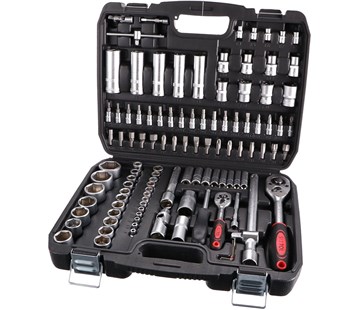 sada nářadí • obsahuje celou škálu nástrčných hlavic, zástrčných klíčů, bitů, dvě ráčny, univerzální šroubovací rukojeť a další • uhlíková ocel • rozměry kufru: 38×30×8,5 cm • 108 kusů v sadě