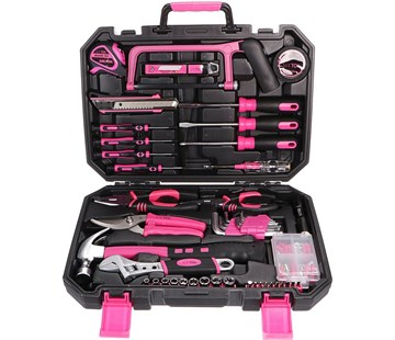 Sada nářadí HOME PINK 128 SIXTOL; Sada nářadí SIXTOL HOME PINK 128 se skládá z nářadí jako jsou kleště, imbusové klíče, kladivo, šroubováky, zahradnické nůžky, nástrčné hlavice, svítilna a další. Součástí je i množství užitečného spojovacího materiálu; v černo-růžovém kufříku