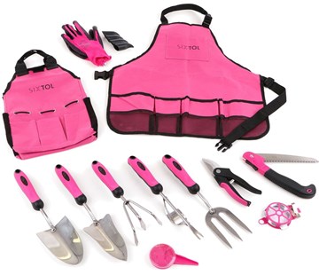 Sada zahradního nářadí GARDEN PINK 12 SIXTOL; obsahuje růžovou brašnu s kapsami a praktickou zástěru; obsahuje lopatku, hrabičky, kultivátor a plečku, zahradní nůžky a skládací pilka na větvě; součástí jsou rukavice a „drápy“, svinovací metr o délce 5m, zahradní drát o délce 20m a sázeč semínek