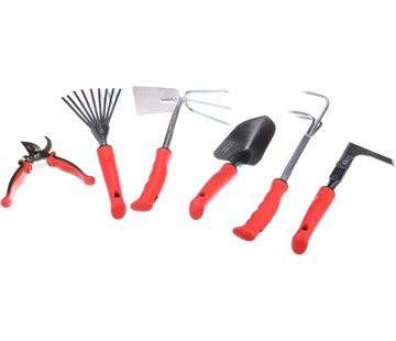Sada zahradního nářadí GARDEN SET 6 SIXTOL; obsahuje lopatku, kombinace motyčky s kypřičem, jednoruční švédské hrabičky, kultivátor, zahradní nůžky a nůž na plevel ve tvaru L; z korozivzdorné uhlíkové oceli; červená barva pro dobrou viditelnost v zelené trávě; rozměry balení: 40,5 x 20 x 9,5 cm