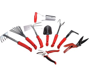 Sada zahradního nářadí GARDEN SET 9 SIXTOL; obsahuje lopatku, kombinace motyčky a kypřiče, švédské hrabičky, zahradní nůžky, kultivátor, nůž na plevel ve tvaru L, ruční hrabičky, nůžky na trávu, mechanický sázeč cibulovin; z korozivzdorné uhlíkové oceli; červená barva pro dobrou viditelnost v trávě