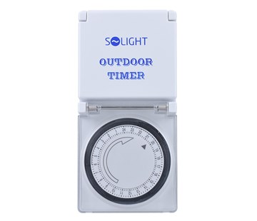 Solight časový spínač, rozpětí 24hod., min. časový úsek 15min., mechanický, dětská pojistka, 230V/16A, 50Hz, kryt zásuvky + gumové těsnění, vodě odolná ochrana IP44