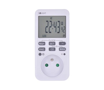 Solight časový spínač, 10 spínacích cyklů s rozlišením 1 minuta, 16 kombinací dní nebo skupin dní, funkce letního času, odpočítávací funkce, náhodné spínání po dobu 10-31minut v časovém rozmezí 6:00h až 18:00h, zabudovaná nabíjecí baterie pro uchování hodnot, výdrž až 100h, 230V/16A, 3600W