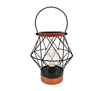dekorativní kovová lucerna s žárovkou s micro LED počet LED diod: 10 světelný tok: 80lm barva světla: teplá bílá režimy: zapnuto / vypnuto napájení: 3 x AA baterie (nejsou součástí) výdrž baterií: cca 100hodin (v závislosti na kvalitě baterií) stupeň krytí: IP20 (vnitřní použití) rozměr: 16,5 x 19 cm materiál: kov, plast barva: černá, měděná