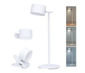 LED nabíjecí stmívatelná lampička s možností změny teploty světla 3v1 - lampičku lze umístit na stolní stojan, clip či nástěnnou konzoli (vše součástí balení) lampičku lze přenášet a napájet z vestavné baterie nebo používat zapojenou v síti pomocí USB kabelu příkon: max. 4W světelný tok: max. 280lm volitelná teplota světla (chromatičnosti): 3000K, 4000K, 6500K (teplá, neutrální a studená bílá) stmívatelná: 3 úrovně jasu zapínání,změna jasu a chromatičnosti dotykem prstu úhel svícení: 120° index podání barev: CRi>80 baterie Li-Ion 18650, 3,7V 2000mAh výdrž baterie: cca 3,5hod na 100% výkon doba napájení baterie: cca 3 hod napájení: DC 5V; 1A (kabel součástí, adaptér není součástí) LED zdroj nelze měnit max. rozměr: cca 320 x 120 x 140mm délka napájecího USB kabelu: 150cm barva: bílá materiál: ABS