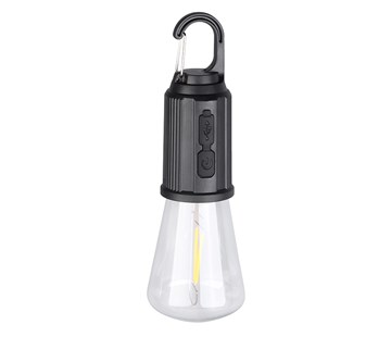 nabíjecí LED kempingová žárovka; světelný tok: 100lm; 3 režimy svícení: 100%, 50%, 30% ; outdoorové užití (stupeň krytí IP44); výdrž baterií min/max: 2hod./6hod.; doba nabíjení: 2hod.; baterie: 3.7V 400mAh Li-Ion; napájení: USB C konektor; rozměry: 180 x 105 mm; barva: černá;