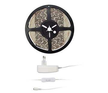 60x LED/m, max. 4,8W/m, Světelný tok 300lm/m, Teplota světla: 3000K (teplá bílá), Krytí IP65, Pásek je vysoce flexibilní, Pásek lze zkrátit dle potřeby (zbylé části je možno dále využít), Samolepící 3M páska, Adaptér s vypínačem: AC 230V / DC 12V, 2000mA, Šířka: 8mm, Cívka: 5m