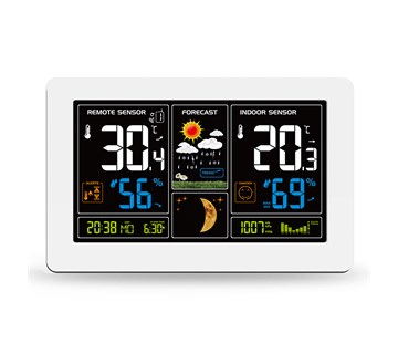 měření vnitřní teploty: 0°C až +50°C měření venkovní teploty: -40°C až +60°C přesnost měření teploty: -+1°C měření vnitřní a vnější vlhkosti: 20% - 95% měření atmosférického tlaku: 600 hPa/mb - 1100 hPa/mb USB nabíjecí adaptér DC 5V/1000mA upozornění na dosažení nastavené venkovní teploty paměť minimálních a maximálních dosažených hodnot teploty a vlhkosti, vnější i vnitřní možnost připojení až 3 bezdrátových senzorů, funkce cyklického přepínání mezi jednotlivými senzory 1 bezdrátový senzor (součástí balení), dosah 60 m ve volném prostoru předpověď počasí v 6 grafických úrovních s indikátorem vývoje ukazatelé stavu baterie pro meteostanici i bezdrátový senzor ukazatel úrovně komfortu čas řízený rádiovým signálem, kalendář, fáze Měsíce budík s intervalem, odložení buzení 5 min indikátor vývoje teplot, tlaku a vhkostí barevný podsvícený displej 7.5" (17,0 x 9,4cm) úsporný režim displeje, 5 úrovní podsvícení displeje, rozsvícení displeje a odložení budíku pomocí dotykového senzoru na horní hraně meteostanice. rychlý a komfortní přístup k ovládacím tlačítkům na boční hraně meteostanice otvor pro uchycení na zeď, opěrný stojánek rozměry meteostanice: 20,5 x 13 x 3 cm max. barva: bílá napájení:hlavní jednotka:2 x AA (LR06) baterie (není součástí balení)adaptér AC 230V,50Hz /DC 5V, 1200mA (součástí balení)senzor: 2 x AA (LR06) baterie (není součástí balení)