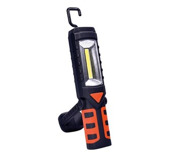Multifunkční nabíjecí LED lampa, 3W COB + 1W LED, 250 + 40lm, výstražné červené světlo na zadní straně, naklápění, výdrž aku.: 3 až 6h, doba nab.: 3h, typ aku.: 3,7V/1200mAh, Li-Ion, USB 5V kabel a DC 12V cig. autoadaptér součástí, prac. teplota: -30°C až +50°C, IP44, rozměry: 50 x 39 x 215mm.