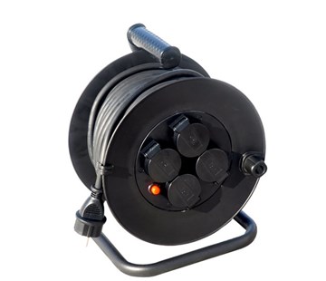 Počet zásuvek: 4, gumový kabel, průřez vodičů: 3 x 1,5mm2, typ kabelu: H05RR-F3, tepelná pojistka, lomená vidlice, barva: černá, délka: 25m, zatížení: 5A/1150W navinutý, 16A/3600W rozvinutý, kryty na zásuvkách, vodě odolná ochrana: IP44.