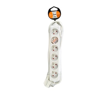 počet zásuvek: 6, průřez vodičů: 3 x 1mm2, typ kabelu: H05VV-F3, lomená vidlice, barva: bílá, délka: 2m, 230V/10A