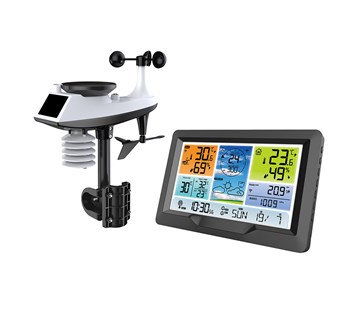 designově propracovaný a perfektně čitelný displej s úhlopříčkou 19cm 3 úrovně podsvícení displeje + vypnuto nastavitelná a přizpůsobitelná konzole včetně montážní sady, pro měření venkovních parametrů s dosahem 100m měření vnitřní teploty (0 - 50°) a venkovní teploty (-40 - 70°C) a vlhkosti (20-95%) přesnost měření teploty: -+1°C měření atmosférického tlaku (600 - 1100 hPa) měření směru větru (0 - 359°) a rychlosti větru (0-180 km/h) měření srážek (0-9999mm) rosný bod, pocitová teplota, tepelný index (heat index), chlad větru (wind chill), možnost připojení až 3 dalších přídavných senzorů k meteostanici, možnost cyklického přepínání trend vývoje počasí rádiem řízený čas (RCC), datum, formát času 12/24, dny v týdnu 10 úrovní grafické předpovědi počasí paměť mezních naměřených hodnot teploty, vlhkosti, větru, srážek dva budíky s odloženým buzením upozornění na slabou baterii v meteostanici, konzoli a u přídavných senzorů alarmy: teploty, vlhkosti, rychlosti větru, srážek opěrný stojánek a závěsný otvor možno připojit až tři teplotní čidla Solight TE9S (nejsou součástí balení) napájení meteostanice: USB napájecí adaptér DC5V/1200mA; 2x AA baterie 1,5V napájení konzole: 3x AA baterie 1,5V napájení přídavného senzoru: 2x AA baterie 1,5V