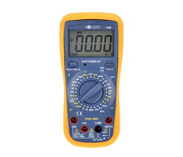 Solight multimetr, měření proudu, napětí, odporu, frekvence, kapacity, teploty, měření true RMS (efektivní hodnota střídavých průběhů), tranzistorový a diodový test, test spojitosti obvodu, vodivostní test, měření parametrů hFE, , elektronická pojistka při přetížení, napájeni: 9V baterie